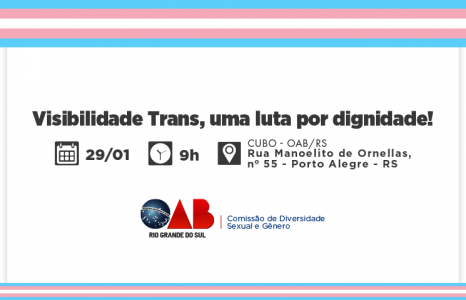 A Comissão de Diversidade Sexual e Gênero da OAB/RS promove, dia 29 de janeiro, das 9h às 13h, o evento “Visibilidade Trans, uma luta por dignidade!”, no Auditório OAB Cubo (Porto Alegre). A atividade integra as ações alusivas ao Dia Nacional da Visibilidade Trans, data instituída pelo Ministério da Saúde para fortalecer a luta por direitos, respeito à identidade de gênero, inclusão social e enfrentamento à transfobia.