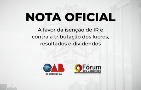 A Ordem dos Advogados do Brasil, Seccional do Rio Grande do Sul, e o Fórum dos Conselhos e Profissões Regulamentadas do RS, representando mais de um milhão de profissionais liberais no Estado,  vêm a público manifestar sua absoluta contrariedade à tributação dos lucros, resultados e dividendos prevista nos Projetos de Lei nº 1.087/2025 e nº 1.952/2019.
