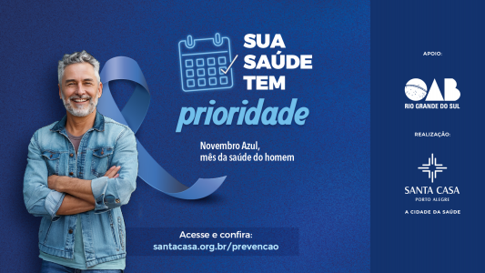 A OAB/RS é apoiadora institucional da campanha “Sua saúde tem prioridade”, promovida pela Santa Casa de Porto Alegre durante o mês de novembro. A iniciativa integra as ações do Novembro Azul, voltadas à conscientização sobre a saúde do homem e à importância do diagnóstico precoce do câncer de próstata, que é o segundo tipo mais comum entre os brasileiros.