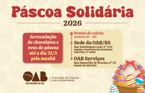 A OAB/RS, por meio da Comissão da Criança e do Adolescente, está promovendo a campanha Páscoa Solidária 2026, uma ação que visa à arrecadação de ovos de Páscoa e chocolates para crianças e adolescentes em situação de vulnerabilidade social atendidos pela Rede Calábria.