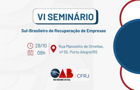 A OAB/RS, por meio de sua Comissão de Falências e Recuperação Judicial (CFRJ), promoverá, na terça-feira (28), o VI Seminário Sul-Brasileiro de Recuperação de Empresas. O evento busca discutir o direito de insolvência e a reestruturação empresarial por meio de um olhar multidisciplinar.