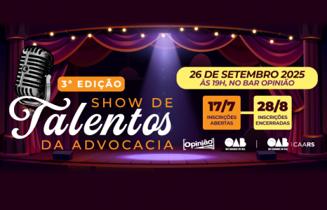 Chegou a hora da advocacia gaúcha de mostrar o seu talento no palco. No dia 26 de setembro, acontece a terceira edição do Show de Talentos da Advocacia. A proposta é reunir os colegas que tenham habilidades artísticas, como cantar, dançar, tocar instrumentos, declamar ou contar piadas. O que vale é a participação, senso de amizade, colaboração e companheirismo em um momento cultural e de lazer. As inscrições estão abertas até o dia 28 de agosto e podem ser feitas aqui.